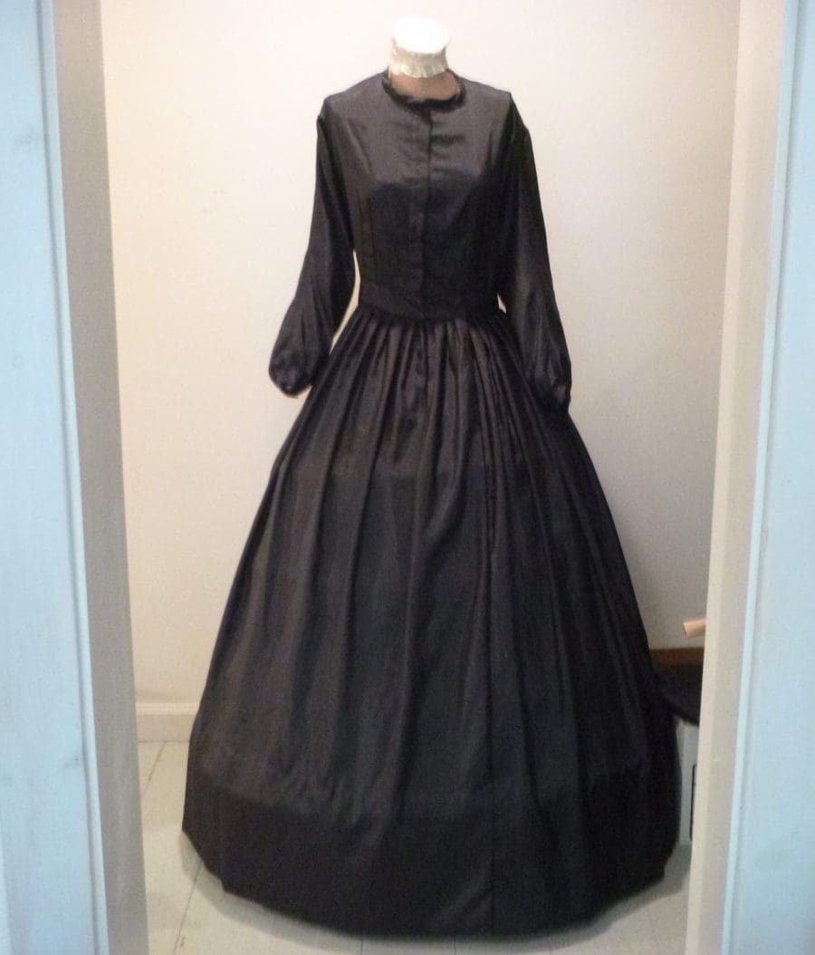 And current customs must be followed. For the first year she wore all black, including a widow’s veil when she was out and away from home. Her activities were limited to church-related events or close family events. During the second half of the second year of mourning a widow at that time could begin to add a bit of colored trim to her clothing. And she no longer needed to wear the veil. As a childless woman, it would have been acceptable for her to marry again after two years of mourning.