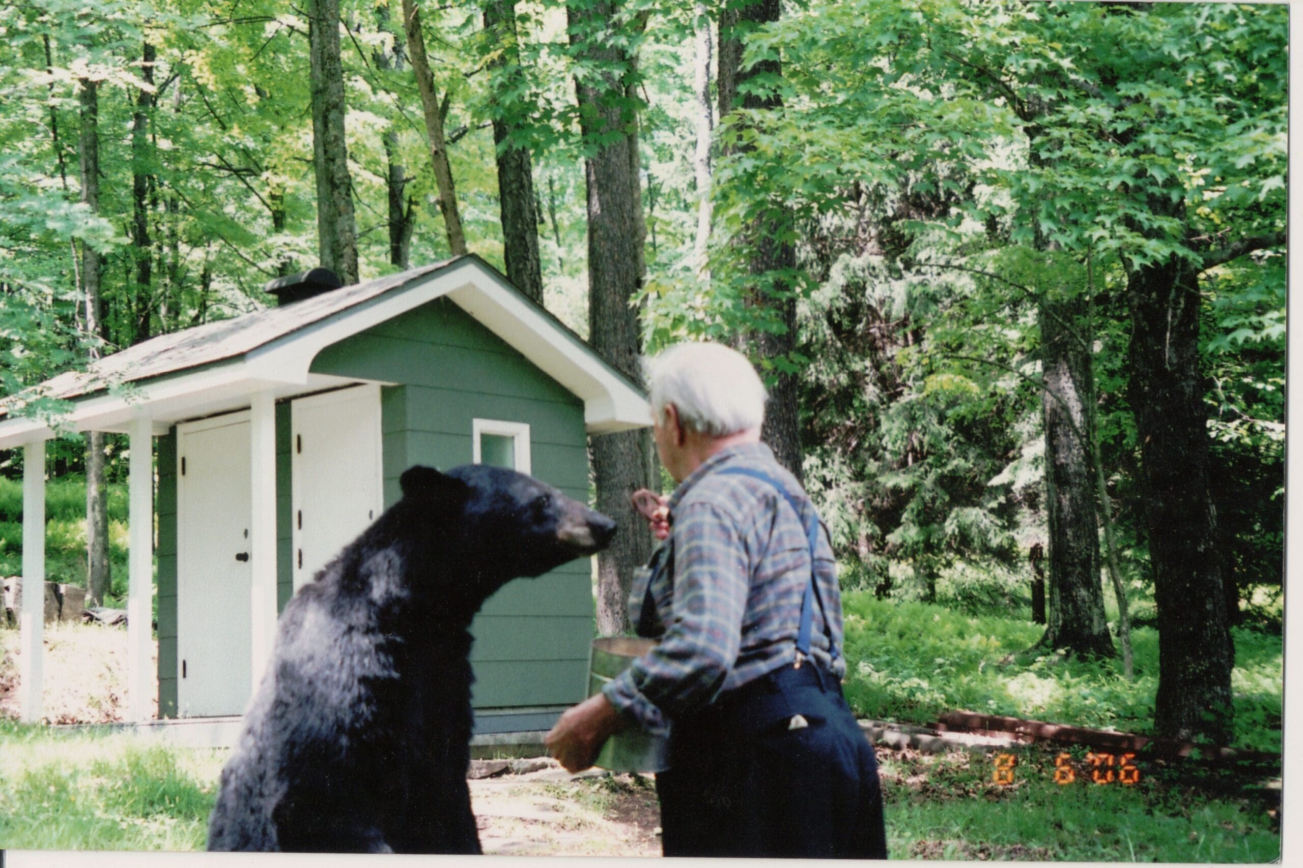 Bob must have been an “animal whisperer,” for animals of all kinds and sizes came to the site and became friends. He was especially close with a big female bear he dubbed “Ma Bear.” She had four cubs in 2003 and five cubs two years later. Her mate, dubbed “Big Guy,” came too from time to time, often settling down a foot or two from the front porch for a snooze. Ma averaged about 350 pounds and Big Guy (right) weighed about 700 pounds.