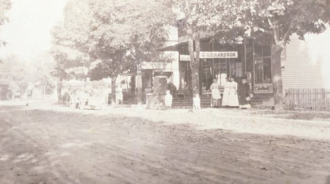 And, we had an early General Store.  It was called Richardson’s General Store and was in half of a building owned by Minnie Long.  The other half housed the A. H. Brubaker Harness Shop.  This building also was one lot in from the intersection, on the southwest side of Route 20.  Pearl and Elizabeth managed the general store, which they opened at 7 a.m.  It stayed open until long after dark, when “nobody came in anymore,” Mrs. Richardson once said. This store also boasted one of the few gas pumps between Girard and Erie.  T. W. Sterrett, who lived in the corner house next door, was the first to own an automobile in town.