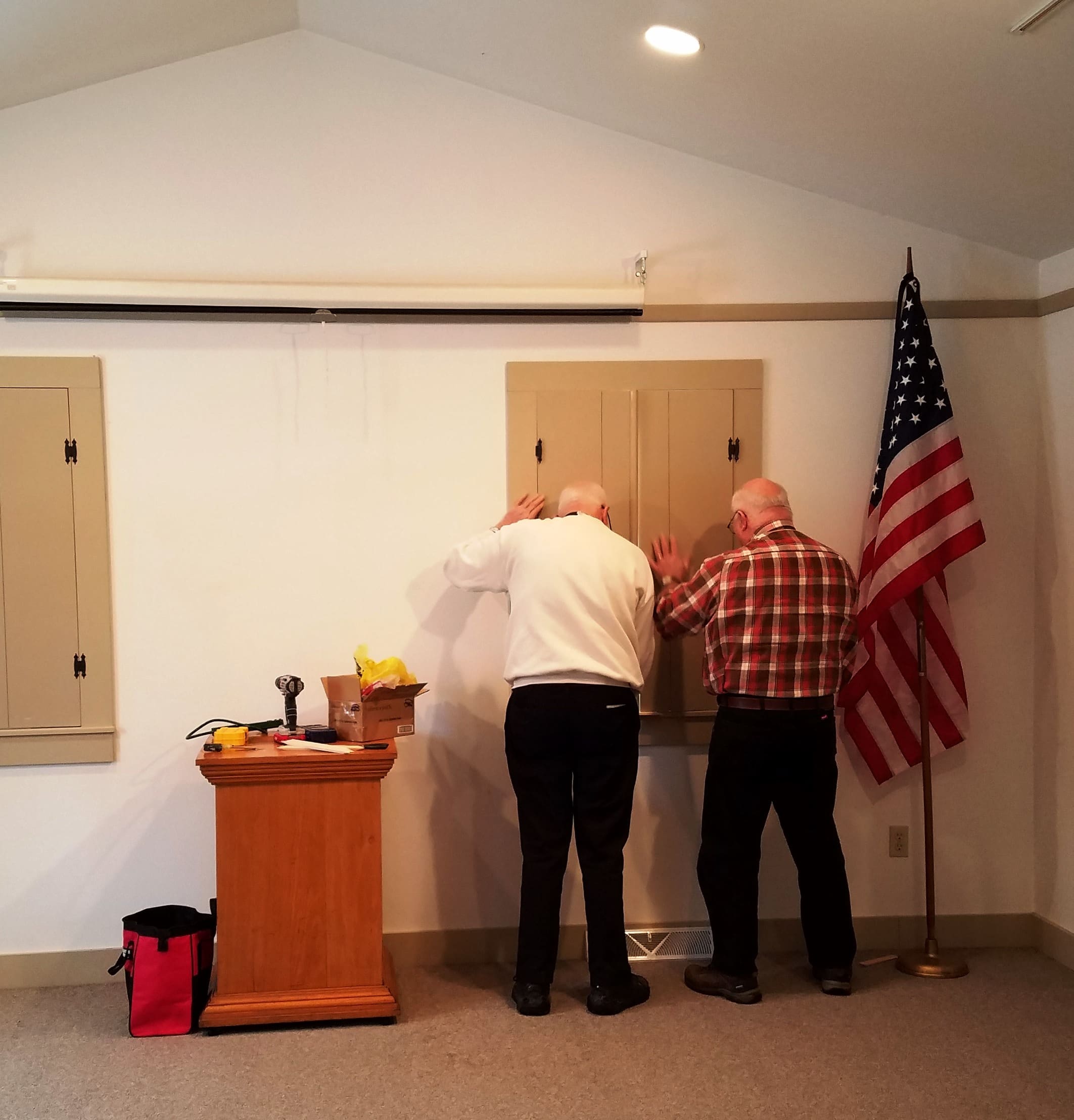 The featured image above shows them back at it, this time putting up shutters on the five windows in the new meeting room.