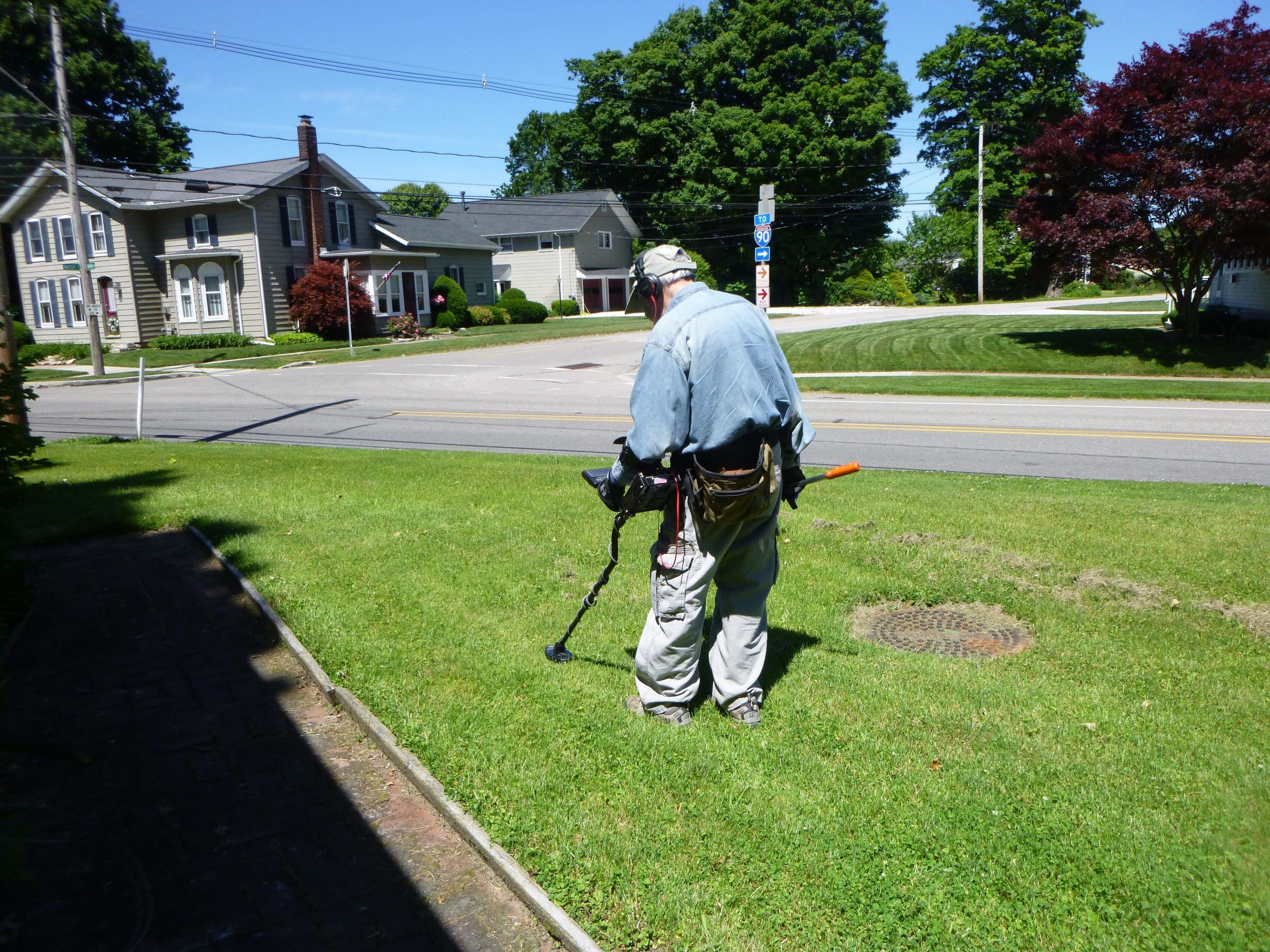 The two were very careful to dig up the sod, place it aside then begin digging the pinging area in earnest. They place the dirt on a cloth and ran their wand over it, all to find the metal piece. Sometimes the piece was still in the ground. It’s a process that was interesting to watch.